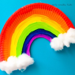 Have you got paper plates? these cut in half make amazing rainbows if not just use card or use old birthday/Christmas cards,colour or paint lots and make a mobile with string or wool and hang up.